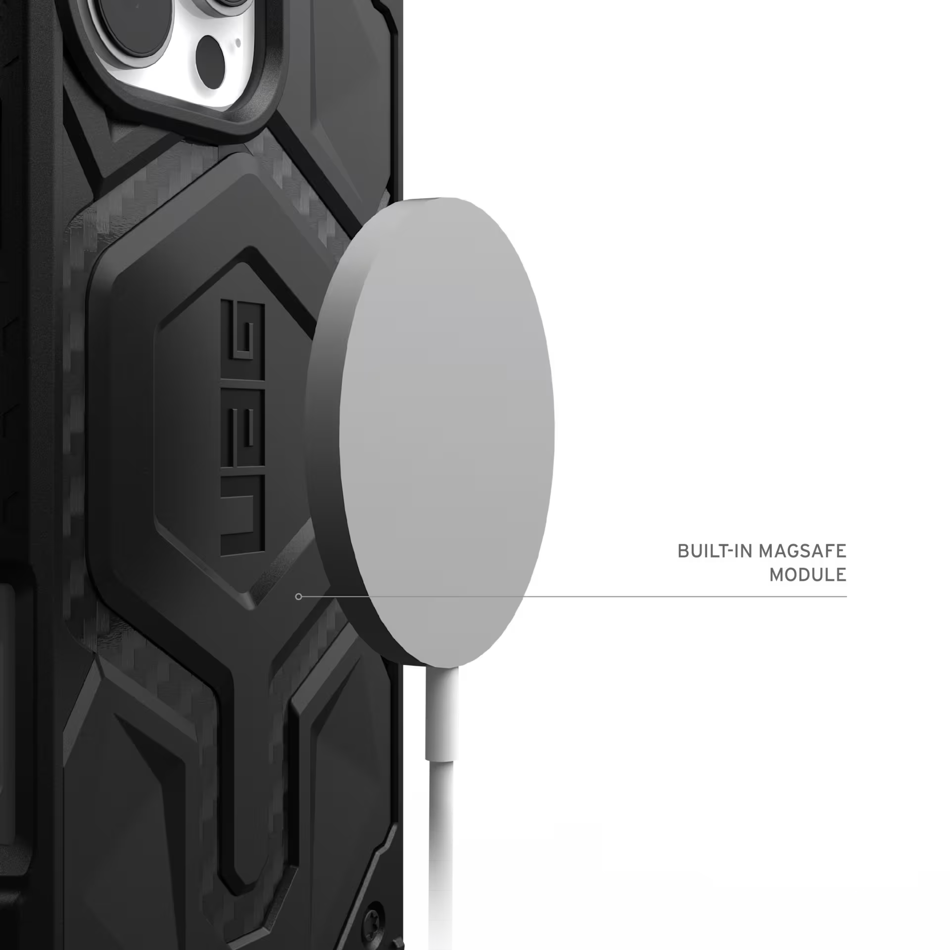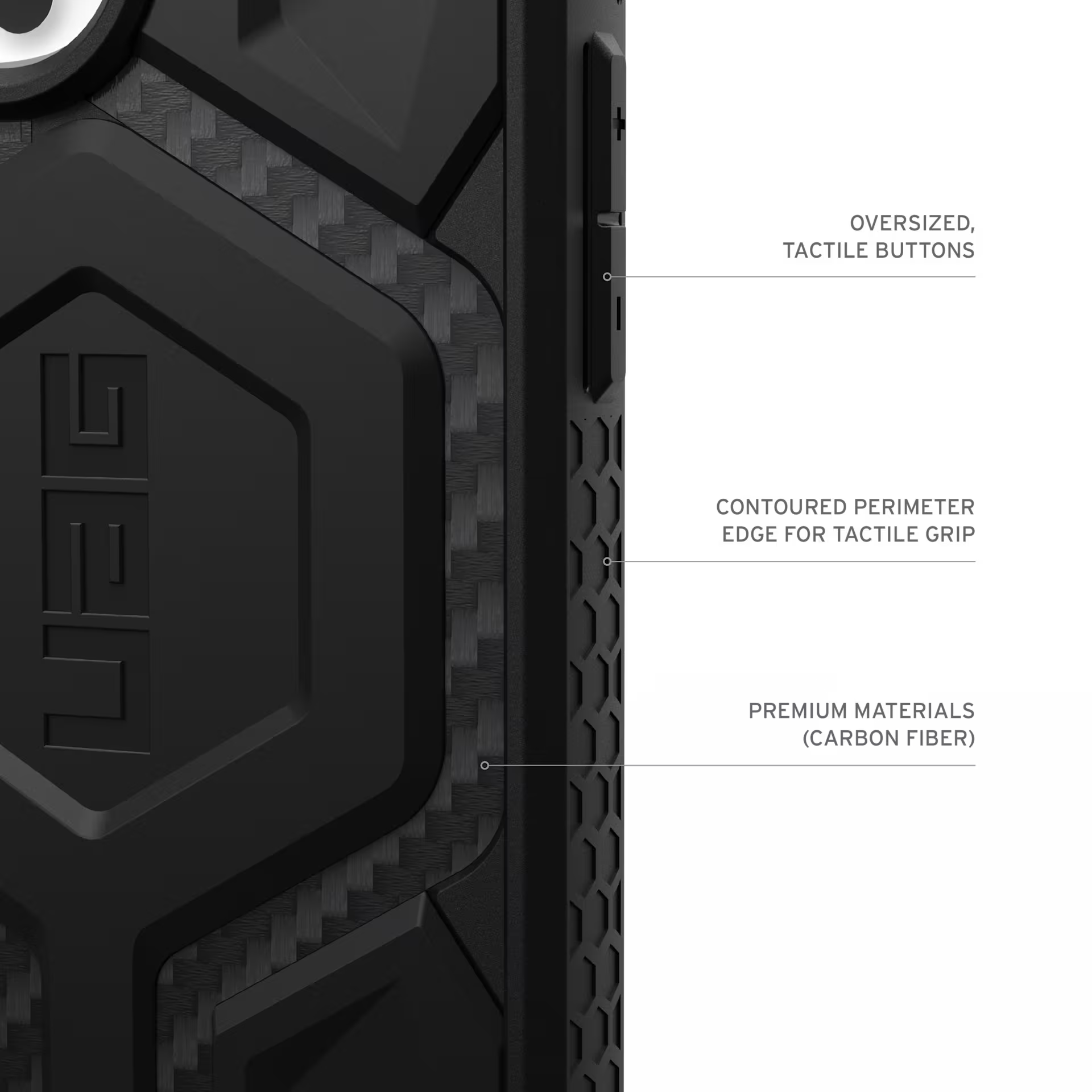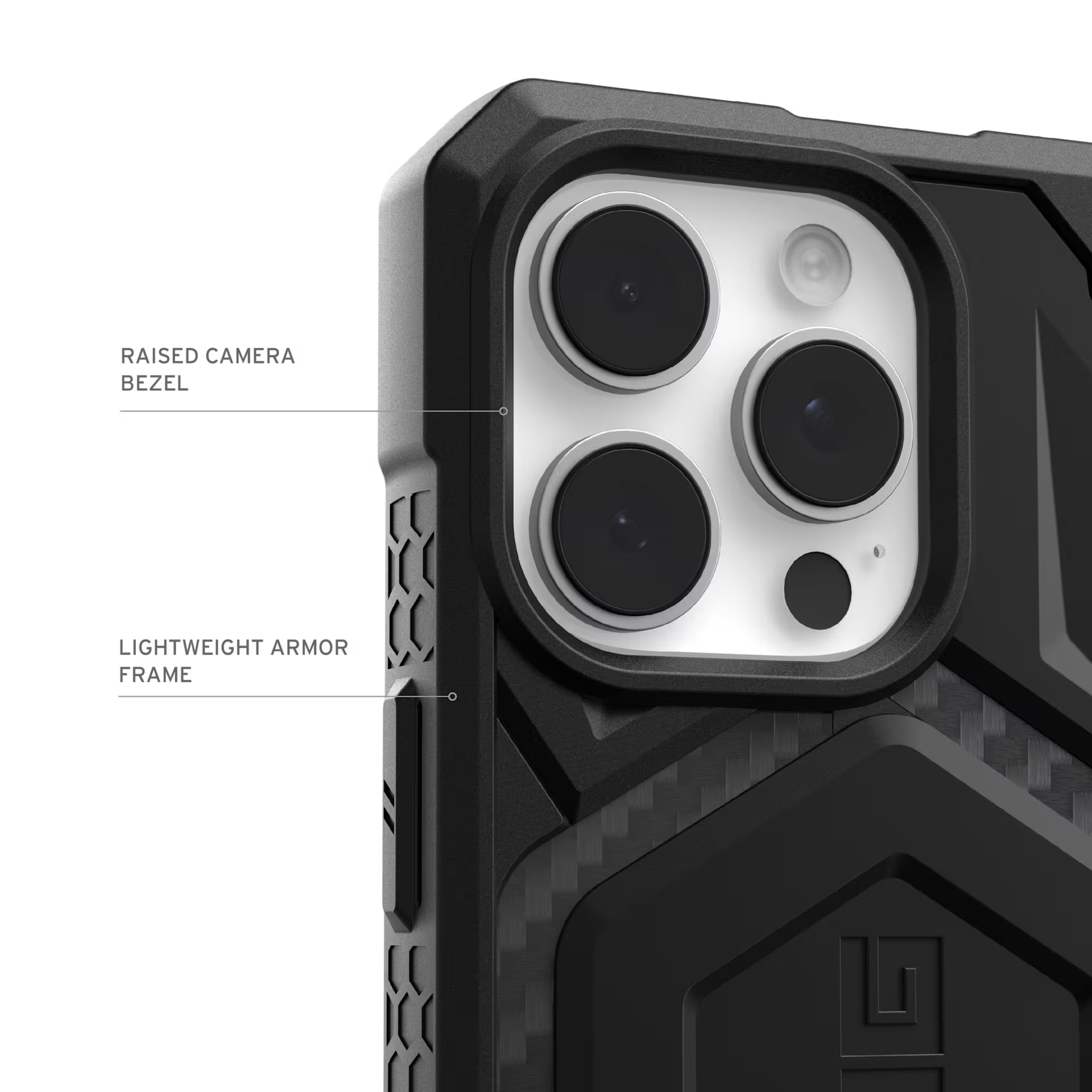 MULTI-LAYER PROTECTION: Our iPhone case is handcrafted with premium materials featuring a feather-light construction with 5 layers of protection starring UAG's signature armor frame, shock-resistant core, layered with carbon fiber/leather, a polycarbonate shear plate, alloy metal hardware, and impact-resistant rubber surround. COMPATIBLE WITH MAGSAFE CHARGING: Built-in magnet module that locks in-place for MagSafe charging compatibility. Compatible with Apple Pay. ENHANCED FUNCTIONALITY: Traction grip surrounds the perimeter for easy handling. Ultra-responsive oversized tactile buttons deliver a crisp, clean click-feel. Integrated lanyard anchor (lanyard not included) for on the go functionality. SCREEN & CAMERA PROTECTION: Soft raised screen surround to protect screen and raised camera bezel to protect the lens. MILITARY GRADE DROP PROOF TESTED: PC + TPU Chassis (TPU frame, PC backplate) & hex pattern for increased shock absorption. 25 ft. Drop Protection (7.6 meters). Meets 2X Military drop-test standards (MIL STD 810G 516.6)